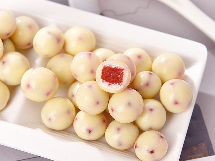 6、模具里倒入一層巧克力液,再放入切好的山楂糕。